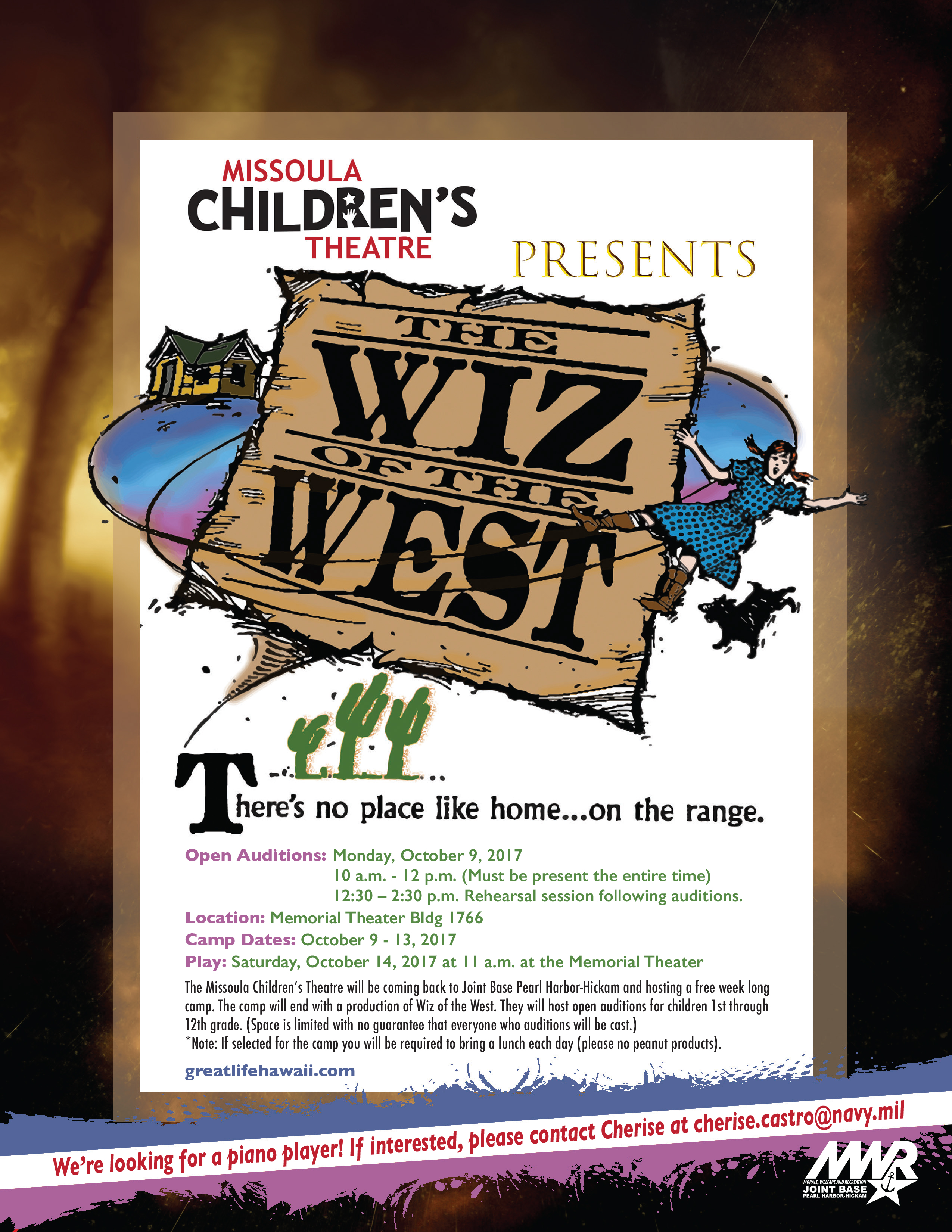 The Missoula Children's Theatre will be coming back to Joint Base Pearl Harbor-Hickam and hosting a free week-long camp. The camp will end with a production of Wiz of the West. They will host open auditions for children 1st through 12th grades (space is limited with no guarantee that everyone who auditions will be cast). Note: If selected for the camp, you will be required to bring lunch each day (pls no peanut products).