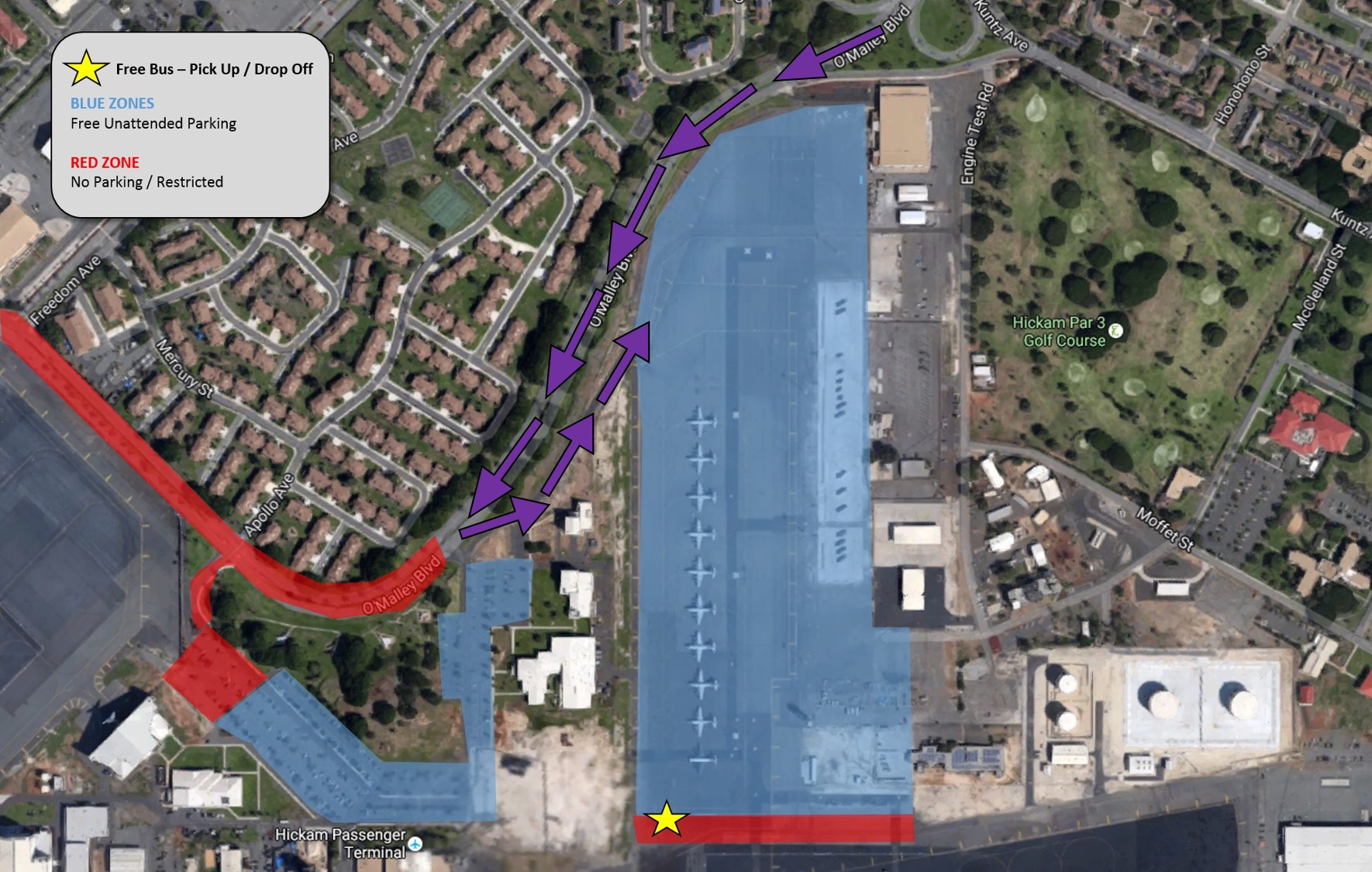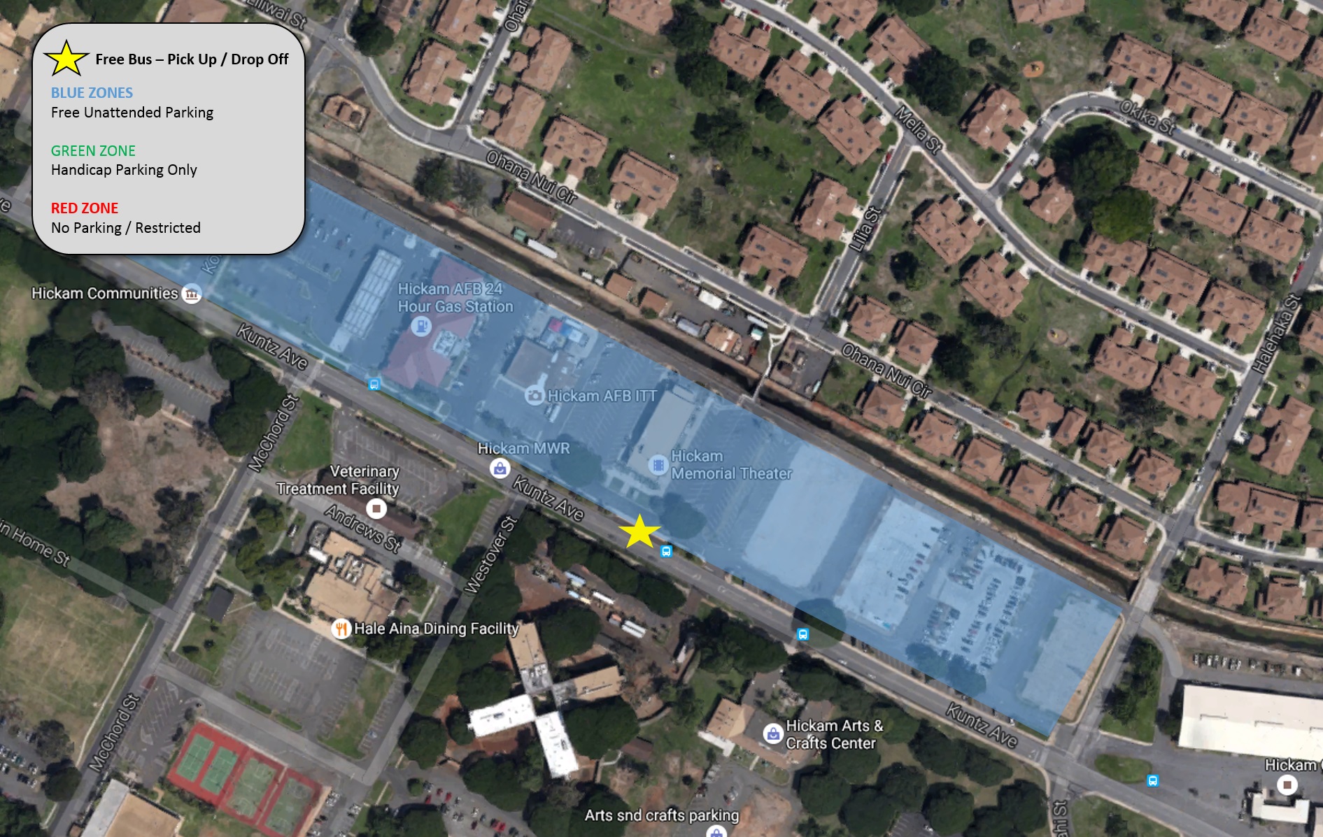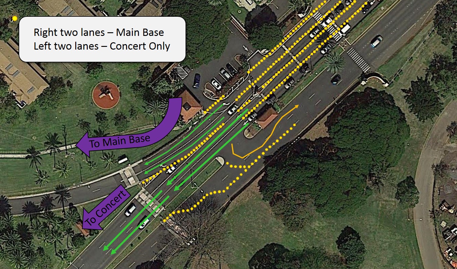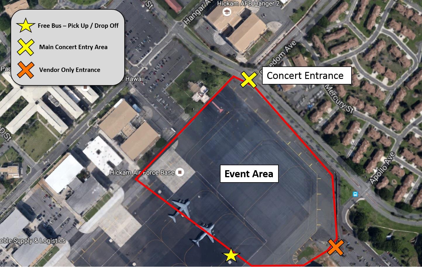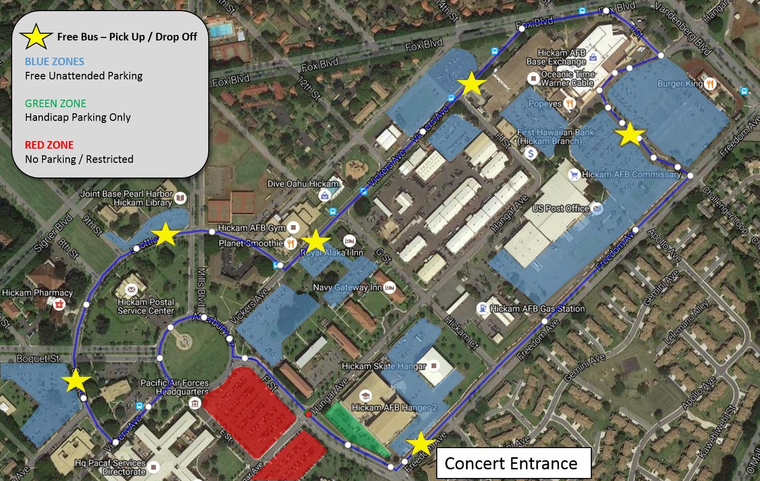 Drivers may enter through any of the gates to the main base at Joint Base Pearl Harbor-Hickam— O’Malley, Nimitz, Makalapa and Kuntz gates. At O’Malley Gate, concert traffic will be directed to the left lanes straight from the gate to concert parking. Base traffic will be the two lanes to the right as they approach O’Malley gate. Handicapped parking will be available with proper placard. Access to handicapped area parking via right lanes at O'Malley gate ONLY (click here or see downloads for handicapped parking route)